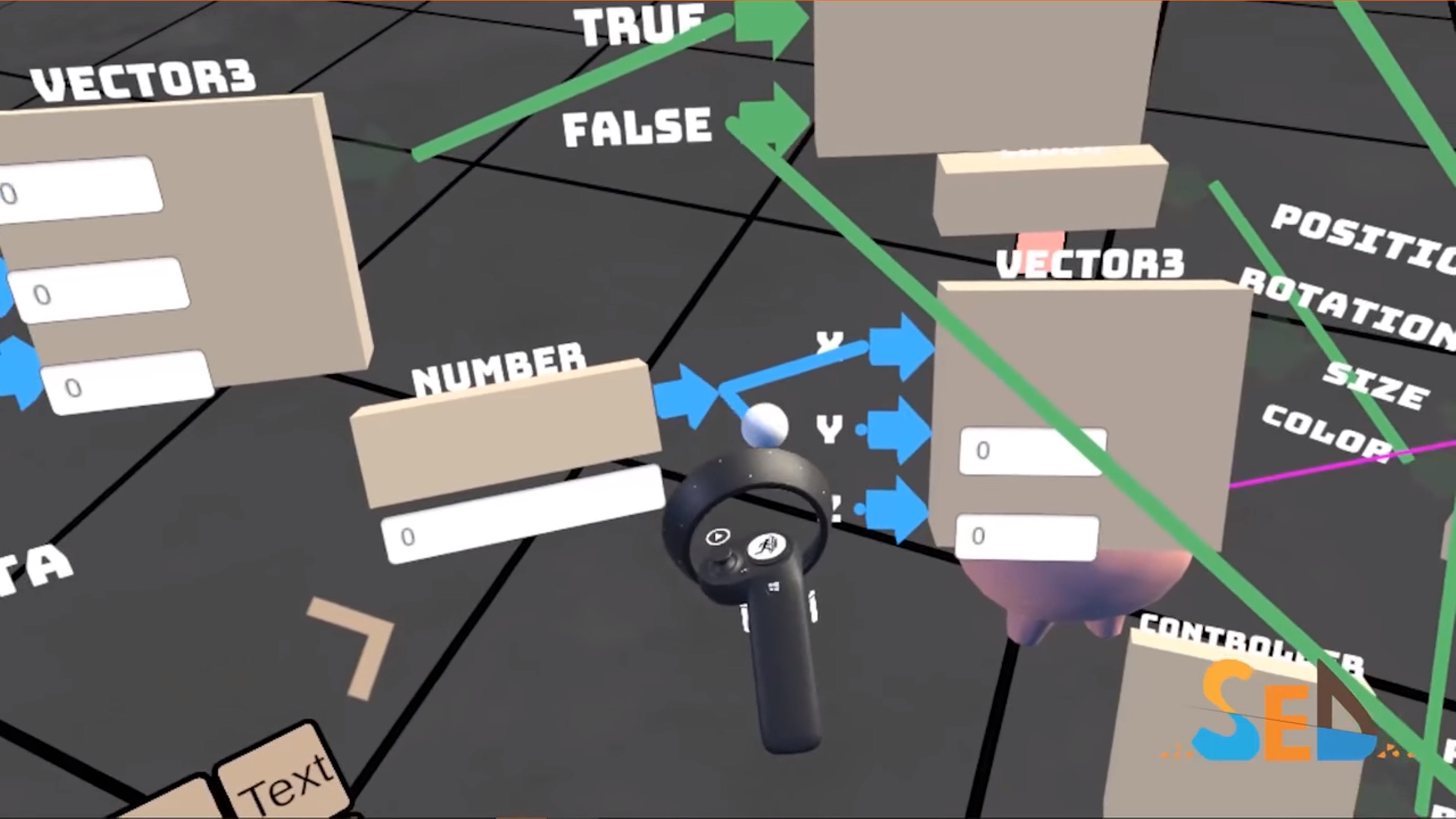 Using a large menu of options, users create objects and place them in the scene, then add nodes which represent coding operations to manipulate the objects and scene.